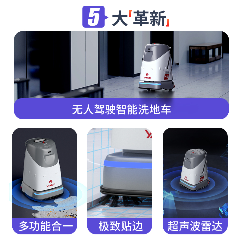 扬子YZ-SC50无人洗地机集洗扫吸拖于一体,搭载 AI 3D 避障与自主路径规划技术,清洁宽度 800mm,每小时清洁1800㎡,适配多类硬质地面。低噪运行,支持定时作业,适用于商场、园区等中大型室内场景。